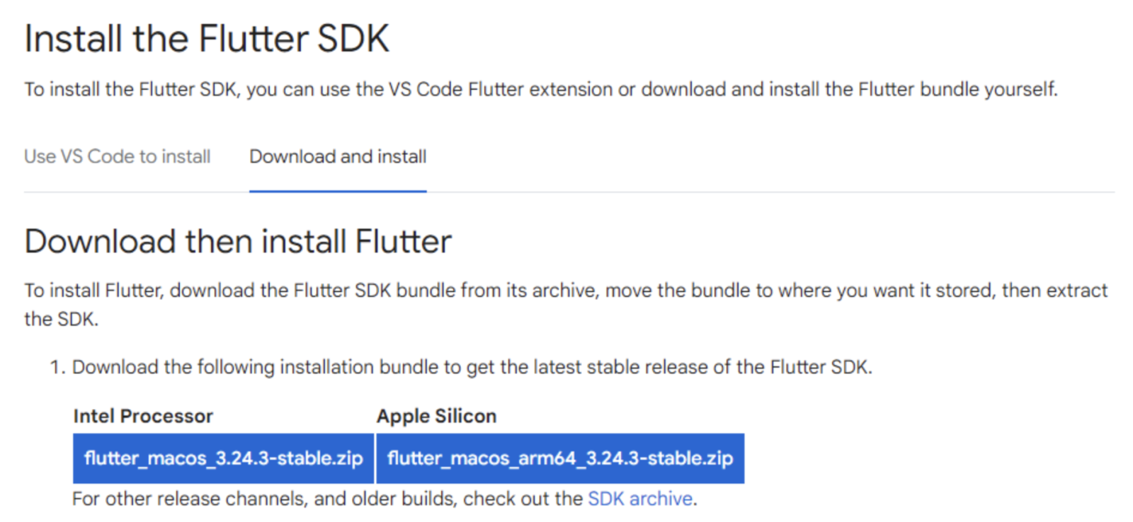 Flutter’ı kurmanın en temiz yolu resmi SDK paketini indirip belirli bir klasöre çıkarmaktır. İndirirken işlemcine uygun (Intel / Apple Silicon) paketi seç.