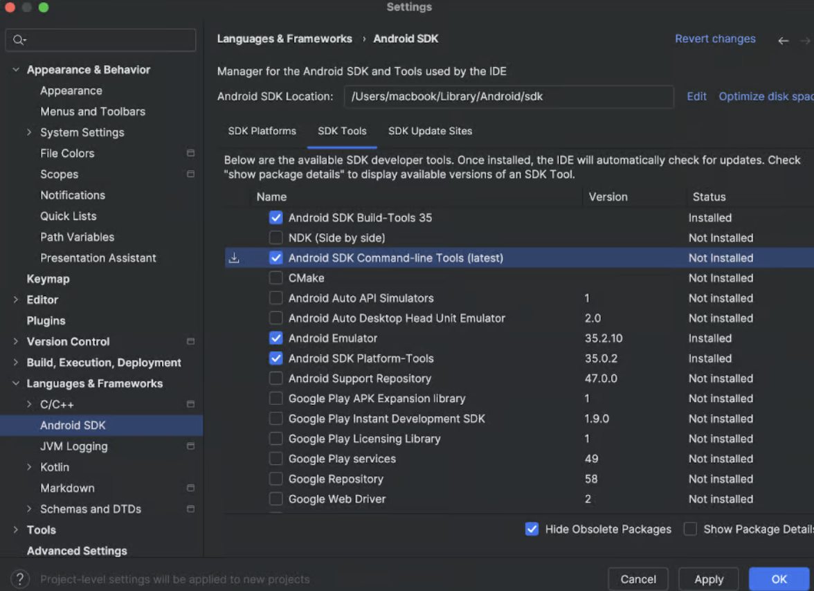 Android hedefliyorsan Android Studio kurup SDK bileşenlerini tamamlaman gerekir. Android Studio içinde SDK Tools kısmından “Android SDK Command-line Tools (latest)” seçili olmalı.
